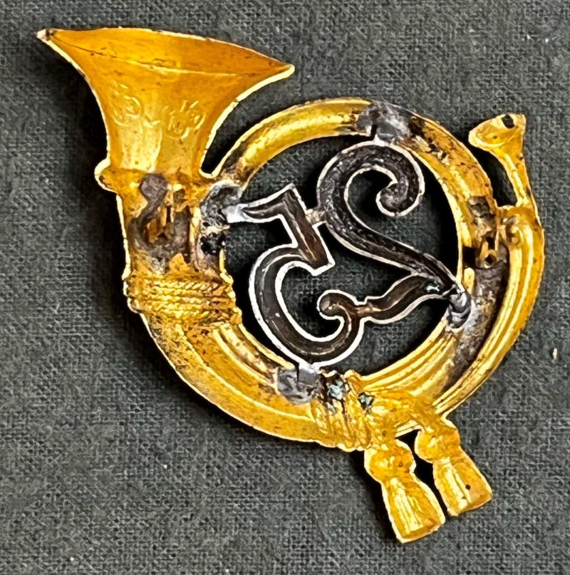 k.k. Jägerhorn für den Jägerhut der 25er Jäger -Tombak geprägt feuervergoldet - Ziffern in Silber gehalten - Hersteller auf der Rückseite: "BSW für Brüder Schneider Wien" - Splinte für die Befestigung vorhanden - 57 x 18 mm - sehr guter Zustand !!