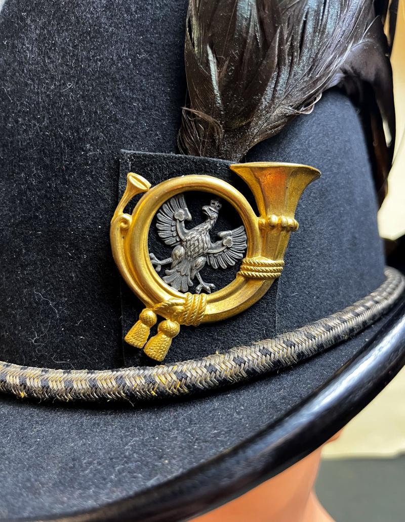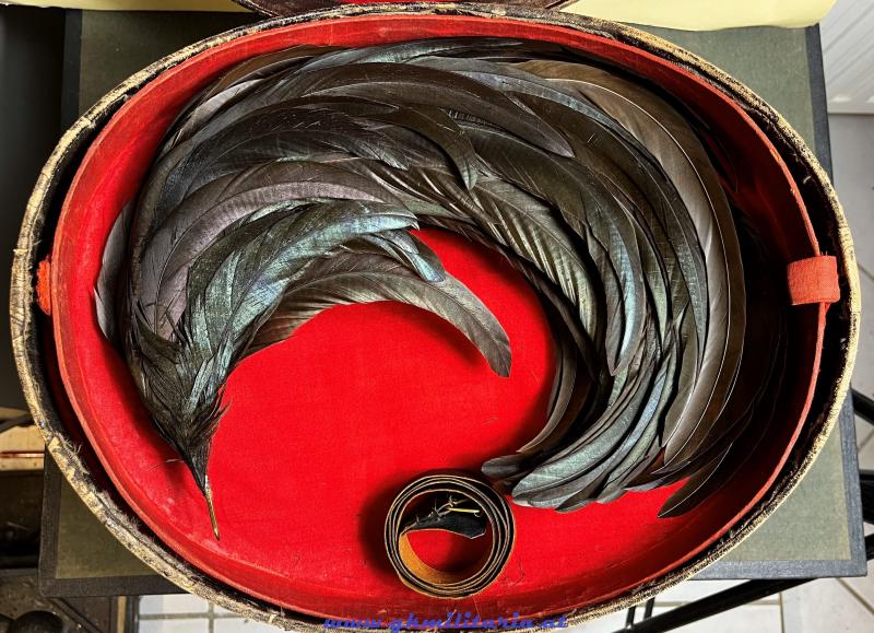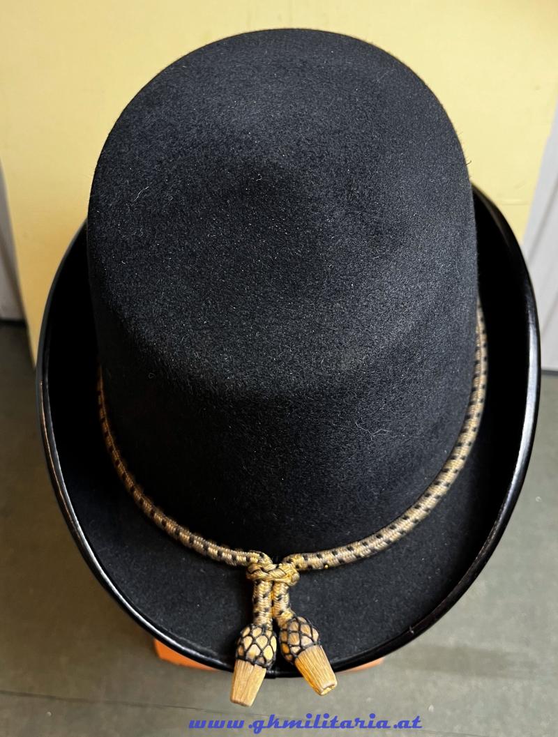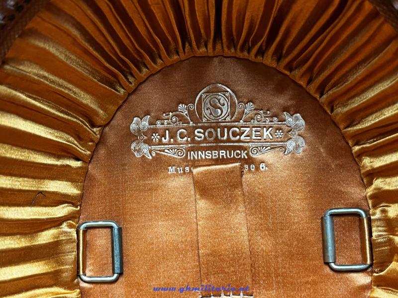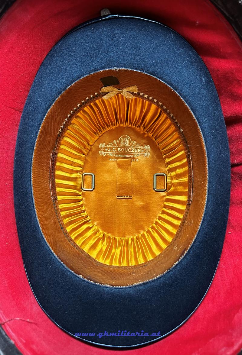 k.u.k. Jägerhut für Offiziere der Tiroler Kaiserjäger mit Hahnenfederbusch - schwarzer steifer Filzkorpus und Jägerhorn mit Tiroler Adler für Tiroler Kaiserjäger - goldene schwarz durchwirkte Hutkordel für Offiziere - eingesteckter originaler Hahnenfederbusch - feines braunes Stirnleder und Innenfutter aus goldbrauner Seide - Herstelleretikett: "J.C. Souczek, Innsbruck, Museumsgasse 6", beide Halterungen für den Sturmriemen vorhanden - Sturmriemen ebenfalls erhalten - Jägerhut im TOP ZUSTAND! - dazu der originale Koffer für den Jägerhut mit eigener Aufbewahrung für den Hahnenfederbusch - auch der Schlüssel des Koffers ist vorhanden - Am Koffer oben und auf der Unterseite verschiedene Versandetiketten der k.u.k. Südbahngesellschaft!